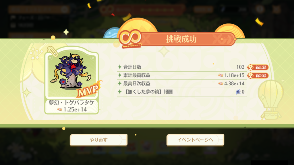 上手く動いた時の「交換の夢」がダントツで強かった。たった102日で強制終了させられる累計最高収益1.0e+15を超えてしまった。